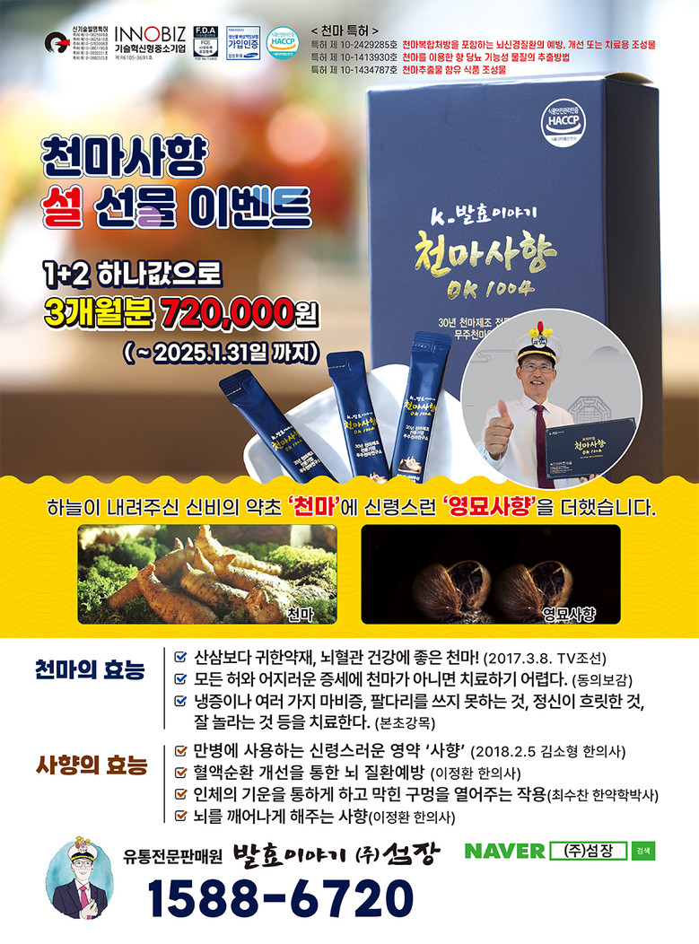 [세계타임즈]최성룡기자 = k-발효이야기 ㈜ 섬장(대표 오용환)에서는 2025년 설을 맞아 ‘천마사향’특별 할인 행사를 진행한다. 이번 행사에서는 선착순 100명에게 1박스 구입하면 2박스를 더 드리는 기회를 제공하여, 소비자들이 3개월 분량의 천마사향을 저렴하게 구매할 수 있도록 했다.