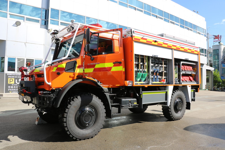 험지펌프차는 3,300ℓ의 물을 운반할 수 있고, 45도 경사도 오를 수 있는 능력을 갖추고 있다. 주행 중에도 방수가 가능하고, 일반 호스 외에 고압 호스릴도 장착돼 있어 산불 화재 진압에 매우 효과적이다.