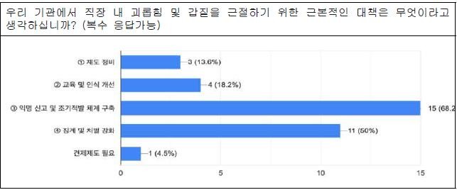 특히 ‘직장 내 괴롭힘’ 문제가 핵심 리스크로 지적되었다. 최근 1년간 직장 내 괴롭힘을 직·간접적으로 경험한 비율이 21.2%에 달했고, 가해자는 팀원 등 동료가 50%로 가장 많았다. 무엇보다 피해자 64%가 “그냥 참는다”고 응답했고, 별도 구제절차는 여전히 마련되지 않은 실정으로 실효성 있는 제도 개선이 시급한 상황이다.