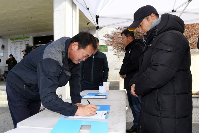 [양구군=세계타임즈 김민석 기자] 김철 안대리비행장항공대대확대반대특별위원회위원장과 의회사무과 직원들이 15일 용하체육관 입구에서 안대리 비행장 항공대대 확대를 반대하는 군민 서명운동을 전개했다.
