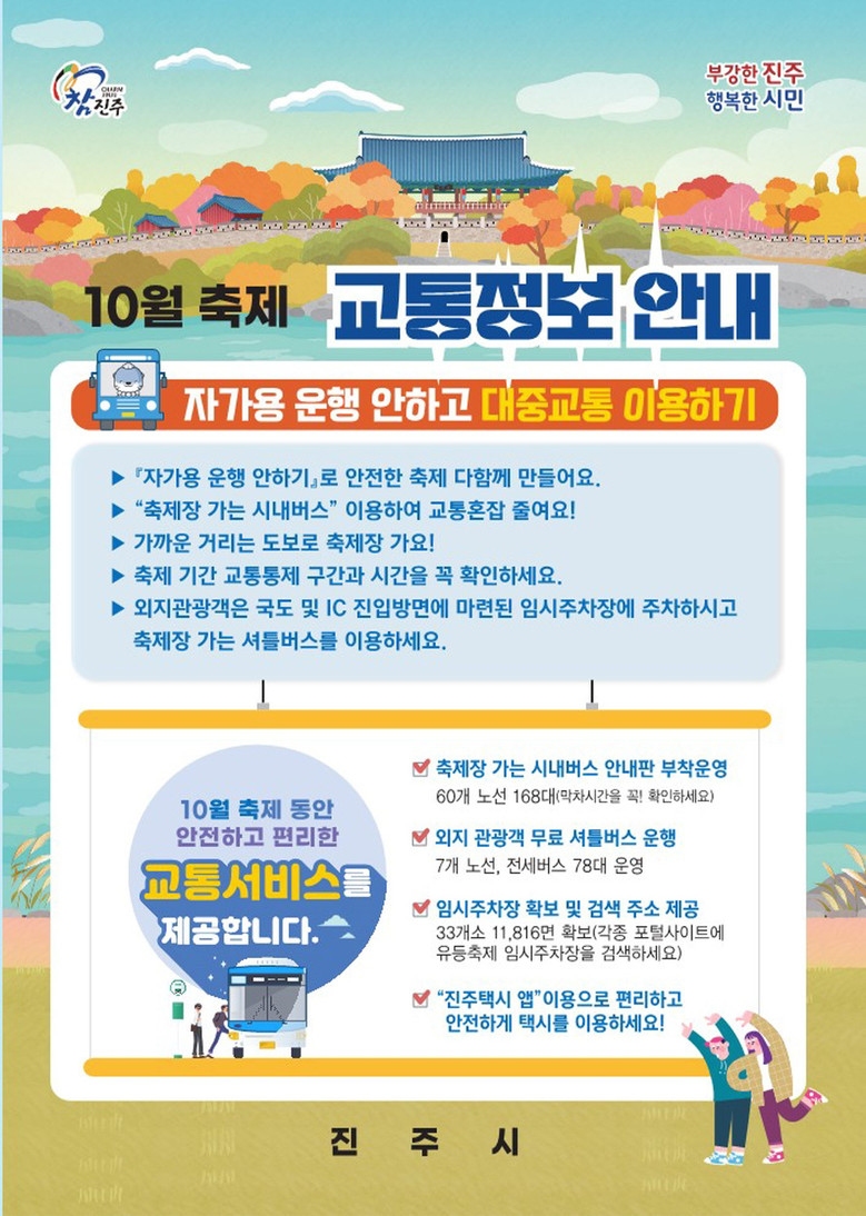 시는 올해 남강유등축제를 포함한 10월 축제 기간에 진주시민과 많은 관광객이 축제장을 방문할 것으로 예상하고, 교통종합상황실 및 교통안전 관리요원 운영, 교통체증 완화대책 추진, 방문객 교통편의 제공, 축제장 주변 차없는 거리 조성 등 맞춤형 교통서비스를 제공하여 축제장을 이용하는 사람들의 불편을 최소화하고 교통안전을 확보하기 위한 대책을 수립했다.