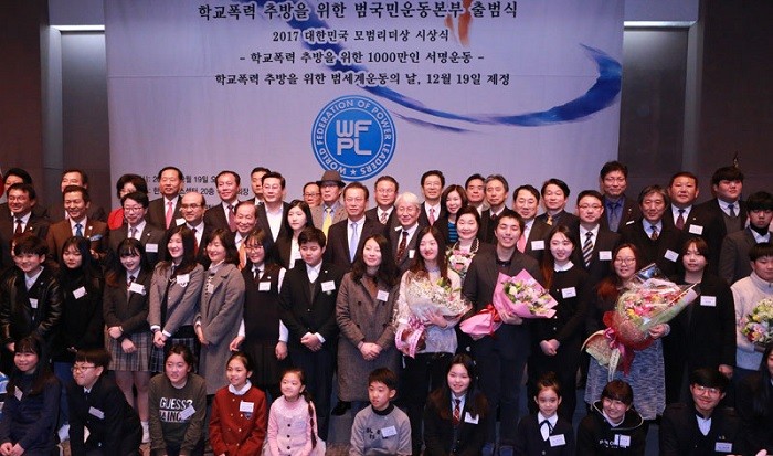 '학교폭력추방 범국민운동본부 출범식'과 '학교폭력추방을 위한 1000만인 서명운동'이 함께 진행된 이날 행사에는 더불어민주당 양승조 국회의원, 최도자 국회의원, 이경재 전 방송통신위원회 위원장, 김유석 성남시 의회 의장, 김학성 법무부 교정본부장, 정영만 전 환경부 차관, 신수원 전 광주국세청장 등 정치·경제·사회·문화계 인사들이 대거 참석했다. 특히 행사장에는 전국 초·중·고 학생과 선생님 등 일선 교육현장의 주인공 등 500여명이 참석해 대성황을 이뤘다.