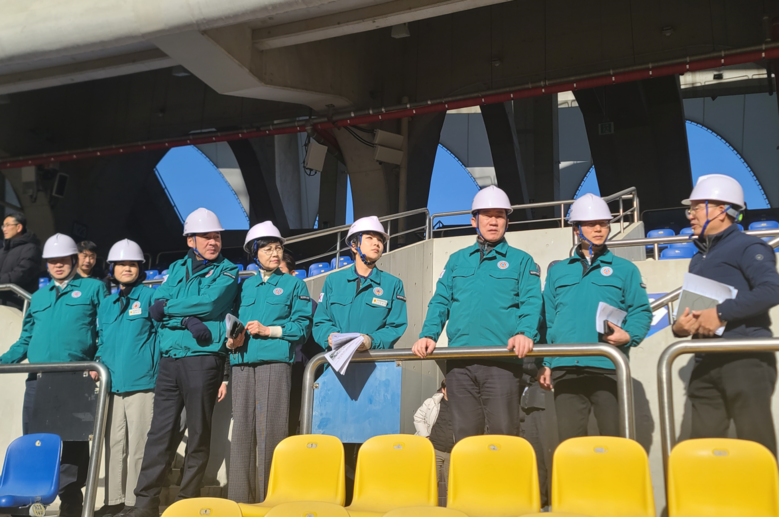 이어서 전국체전 개최 예정지로 이동하여 대회 개최를 위한 시설 개선사업 추진상황을 점검하였다. 아시아드 주경기장에서는 육상 트랙 공사와 대회 운영 사무실 및 편의시설 공사 진행상황을 점검하였고, 사직실내수영장에서는 지붕공사 및 경기장 타일 교체 상황 등을 확인하였다. 이후 사직 론볼경기장에서는 경기장 확대 및 지붕막 설치 공사 진행상황 등을 살펴보며 대회 준비를 위한 차질 없는 시설 개선 공사 추진과 함께 작업자 안전도 당부하였다.