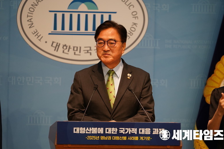 '우원식' 국회의장이 27일 서울 여의도 국회 소통관에서 열린 '대형산불에 대한 국가적 대응 과제' 특별보고서 발간 기념 기자브리핑에서 인사말을 하고 있다.