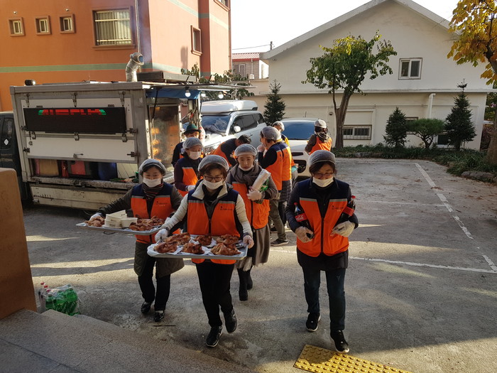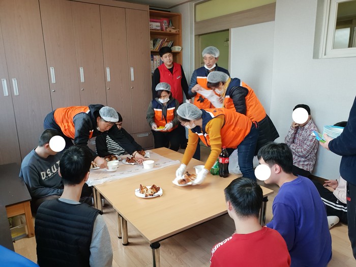 이날 봉사에는 신상일 단장을 비롯한 자원봉사자 15명의 회원들이 2층, 3층, 4층에서 거주하는 지적장애인들에게 바비큐 통닭을 전달하였다.