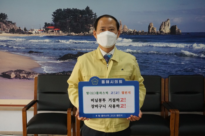 [동해시=세계타임즈 김민석 기자] 김기하 동해시의회 의장은 9일 생활 속 플라스틱 줄이기 실천 운동인 ‘고고챌린지’에 참여했다.