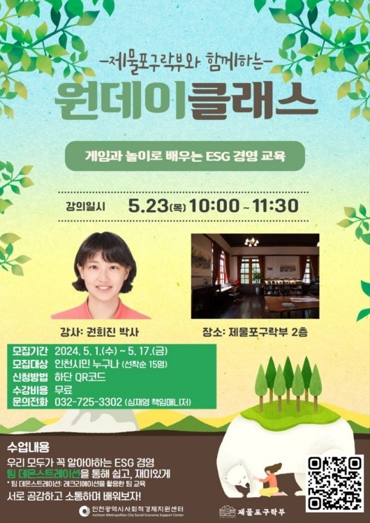 사회적협동조합 맑은공기(이사장 이성철)와 (사)한국ESG경영지원협회(회장 임원빈)는 2024년 5월 23일 10:00 ~ 11:30분까지 제물포구락부 메킨지홀에서 국내 최초로 ‘게임과 놀이로 배우는 ESG경영 교육’을 성공리에 진행했다.