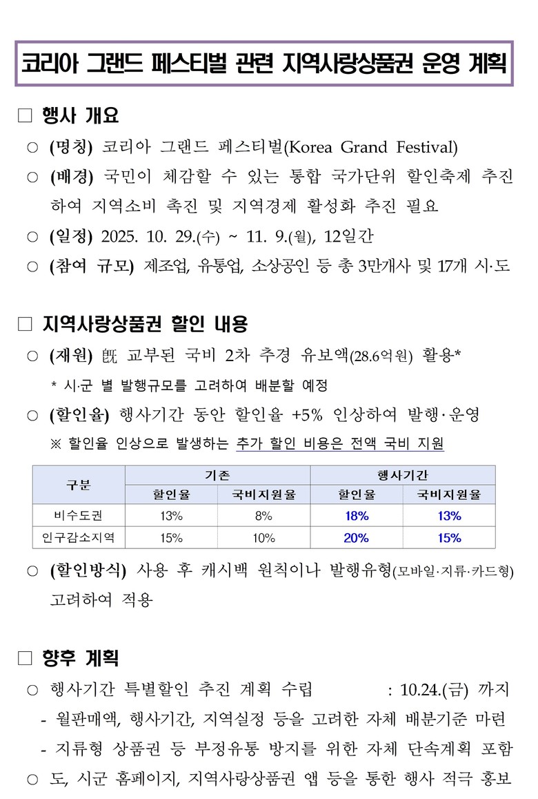 이번 행사는 국민이 체감할 수 있는 국가단위 통합 할인축제로, 내수 진작과 소상공인 매출 확대를 목표로 전국적으로 약 3만개의 기업이 참여할 예정이며, 충청북도는 지역경제 활성화와 도민 소비 촉진을 위해 지역사랑상품권 할인 인센티브를 기존 13~15%에서 18%~20%*로 확대 지원한다.