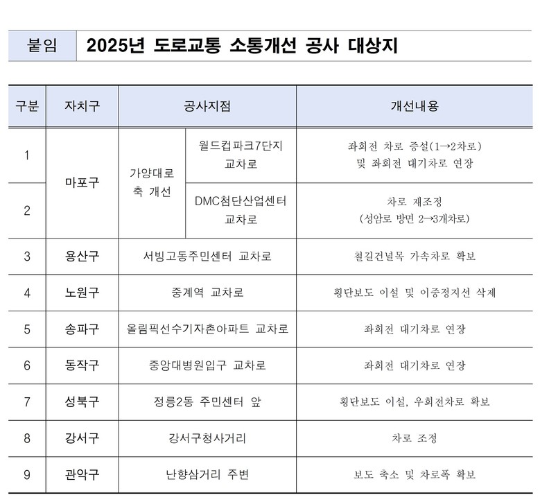서울시는 이달 말까지 시내 총 9곳을 대상으로 ▴교통 정체 개선 ▴교통안전 확보 ▴불합리한 교통체계 정비 등 ‘도로교통 소통개선 사업’을 추진한다고 밝혔다. 대상지에는 차로 증설, 대기차로 연장, 차로 운영 개선 등 교통 흐름 향상을 위한 사업이 이뤄진다.