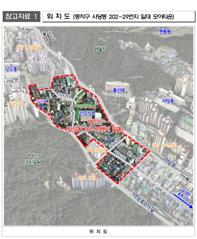 이 지역은 반경 500m이내 7호선 남성역이 인접해 교통이 양호하고 신남성초등학교, 상도중학교가 바로 옆에 위치해 교육 환경이 우수한 편이다. 사당동 202-29번지 일대 모아타운 관리계획 지정에 따라 주택 공급이 확대되며 주민들의 주거 안정에 기여하고 편리하고 안전한 주거환경으로대폭 개선될 것으로 기대된다.