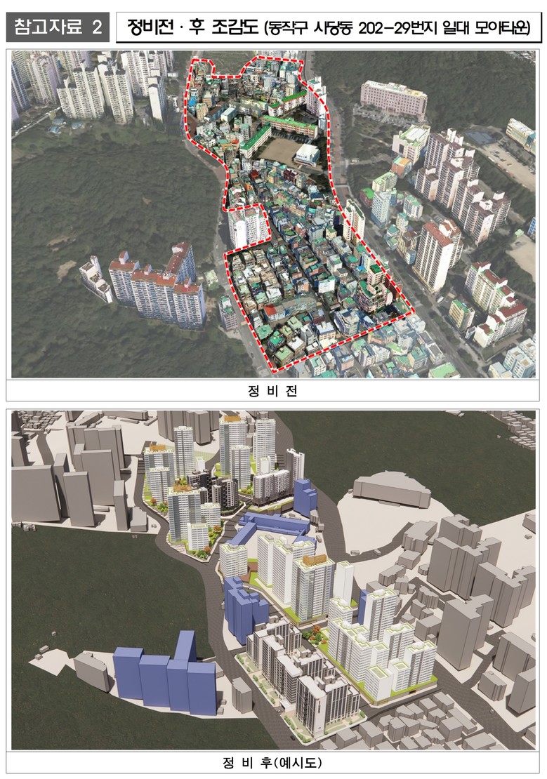 동작구 사당동 202-29번지 일대 모아타운은 기존 세대수 905세대에서 총 1,725세대(임대 236세대 포함)가 조성돼 주택공급이 대폭 확대된다.