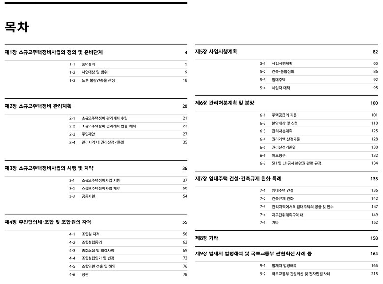 - 조합원 자격·분양·건축규제 완화 등 9개 장으로 구성, 사업 단계별 검색 용이
