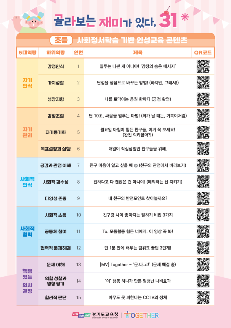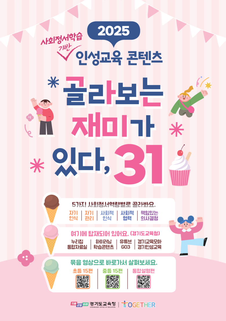 자료는 모두 31편(초등 15편, 중등 15편, 통합설명 1편)으로 제작해 골라서 보는 재미를 느낄 수 있다. 학교와 가정에서는 제공된 콘텐츠를 ▲교육과정 연계 ▲학급 운영 및 교원 연수 ▲가정 연계 인성교육 자료로 다양하게 활용할 수 있다.