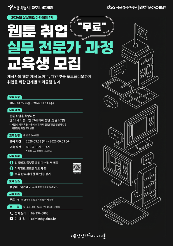 서울시가 운영하는 웹툰·웹소설·애니메이션 분야 전문 교육기관인 ‘상상비즈아카데미’가 2026년 상반기 4기 교육생 모집에 나선다. 실무 중심의 교육을 통해 글로벌 K-콘텐츠의 주인공을 육성한다는 계획이다.