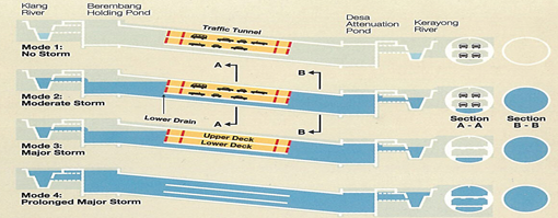 말레이시아 정부는 비가 오면 수시로 넘쳤던 클랑강 범람을 막고 평상시에는 쿠알라룸푸르 시내 교통 정체를 해소하기 위해 '07년 복합터널 ‘SMART’를 건설했다. 일정 강우량 이상 비가 내리면 차량 통행을 통제하고 하천 유량을 조절하는 통로로 사용한다.