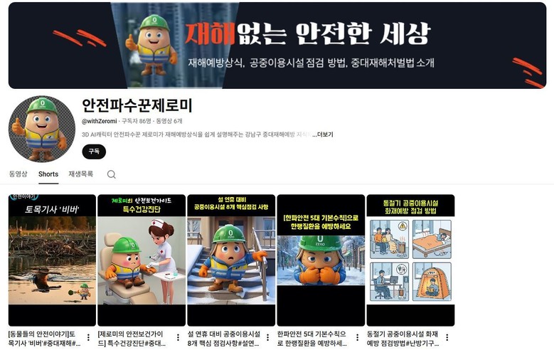 현장 교육과 점검에 더해, 올해부터 영상 콘텐츠를 활용해 안전수칙 정보를 더 쉽게 접할 수 있도록 했다. 구는 지난 2월 3일 중대재해 예방 유튜브 채널을 새롭게 개설하고, ‘중대재해 제로(ZERO)’를 뜻하는 AI 캐릭터 ‘안전파수꾼 제로미’를 활용한 쇼츠 콘텐츠를 제작·배포하고 있다. 담당 직원이 AI 도구와 편집기를 활용해 자체 제작한 콘텐츠를 월 2회 게시한다. 콘텐츠는 한랭질환 예방 수칙, 설 연휴 대비 핵심 점검사항, ‘제로미의 특수건강진단’ 등 일상 속 재해예방 정보를 캐릭터를 통해 쉽고 재미있게 전달하는 방식으로 구성했다.