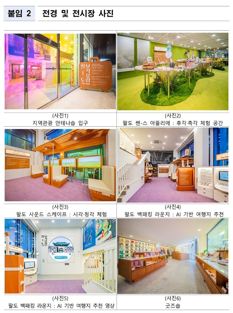 전시관은 오감 체험을 중심으로 후각과 촉각을 활용한 체험을 제공하는 ‘팔도 쎈-스 아뜰리에’, 시각과 청각을 중심으로 한 몰입형 콘텐츠를 선보이는 ‘팔도 사운드 스케이프’, 알고리즘 기반 여행지 추천 서비스를 운영하는 ‘팔도 백패킹 라운지’ 등 세 개 공간으로 구성돼 있다.