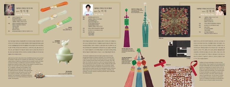 11월12일(수) 오전10시 서울무형유산교육전시장에서는 서울시 무형유산 ‘자수장’, ‘매듭장’, ‘옥장’의 합동 전시가 시작된다. 개막과 동시에 자수장 김현희 보유자와 매듭장 노미자 보유자의 기능을 선보이는 공개행사가 열리고, 14일(금) 오후 2시에는 옥장 엄익평 보유자 공개행사가 이어진다.