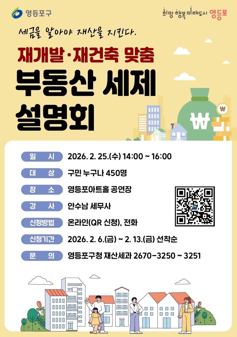 - 전문 세무사의 특강… 재개발·재건축 맞춤 취득세, 양도소득세 등 세금 정보 제공 [영등포구 세계타임즈=이장성 기자] 영등포구(구청장 최호권)가 영등포 전역에서 87개 재개발 재건축 등 정비사업이 추진되면서 높아진 부동산 세제에 대한 관심에 부응하고자, 오는 25일 영등포 아트홀에서 ‘재개발 재건축 맞춤 부동산 세제 설명회’를 개최한다고 밝혔다.