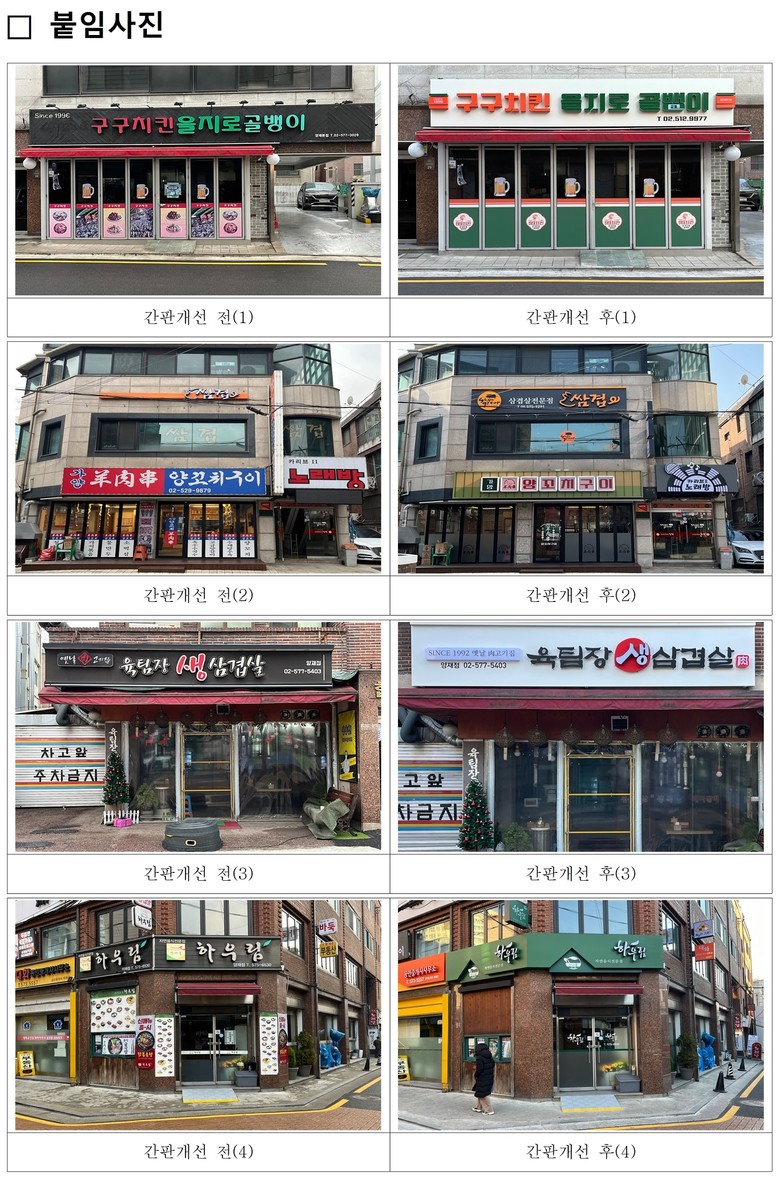 한편 구는 행정안전부 산하 한국옥외광고센터에서 주관하는 ‘2025년 청년참여형 옥외광고 디자인프로젝트’에 민선8기 서울시 자치구 중 유일하게 선정되어 서리풀 악기거리 21개 업소의 간판을 정비한 바 있다. 이어 올해도 ‘2026년 행정안전부 간판개선사업’에 서울시 자치구 중 유일하게 선정되어 노후ˑ불법 간판 정비 와 도시미관 개선은 물론 지역상권 활성화에도 적극적으로 힘을 쏟을 예정이다.