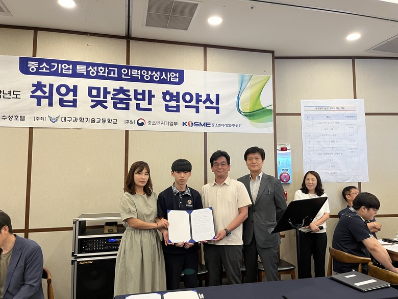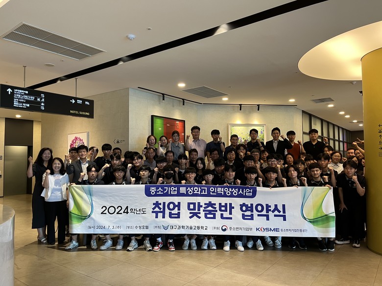 [대구 세계타임즈=한윤석 기자] 대구과학기술고등학교(교장 윤석희)는‘2024년도 중소기업 특성화고 인력양성 사업’을 통해 25명의 학생을 지역 우수 중소기업과 매칭하고, 지난 7월 3일(수) 학생, 학부모, 기업 임원 및 인사담당자, 교사 등 총 87명이 참석한 가운데 ‘취업 맞춤반 3자 협약식’을 개최했다.