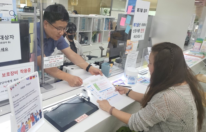 | ▲ 용산2가동주민센터 직원이 외국인 전입자에게 외국어 생활정보 안내문을 전달하고 있다 |