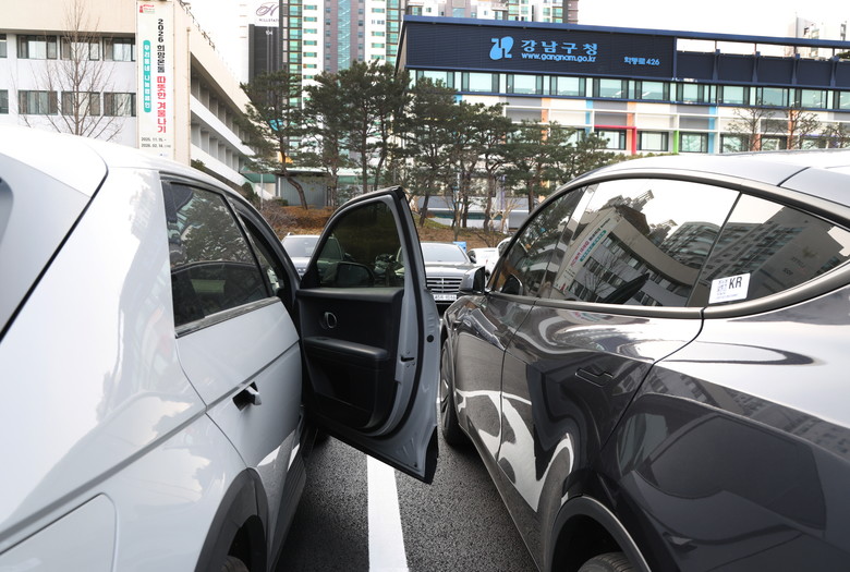 현행 「주차장법 시행규칙」 제3조, 이른바 ‘문콕방지법’은 2019년 3월 이후 신설 주차장부터 적용된다. 2001년부터 사용 중인 강남구 청사는 해당 규정을 적용받지 않지만, 구는 민원인 편의를 우선시해 자발적으로 기준을 상향 적용했다.