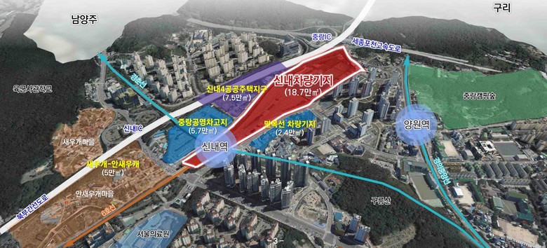 먼저 ‘신내차량기지 및 주변지역 개발전략 수립’ 사업은 차량기지 이전을 전제로 한 개발 전략 마련을 목표로 한다. 트리플 환승역세권(경춘선·6호선·면목선 예정)과 연계해 자족형 복합도시이자 친환경 중심지로 조성하는 방안을 수립한다. 구리, 남양주를 비롯한 경기권·강원권과 연결되는 서울 동북부 관문 도시로의 성장을 도모하며, 구는 2026년까지 기본구상과 실행계획 수립을 서울시와 함께 적극 지원할 방침이다.