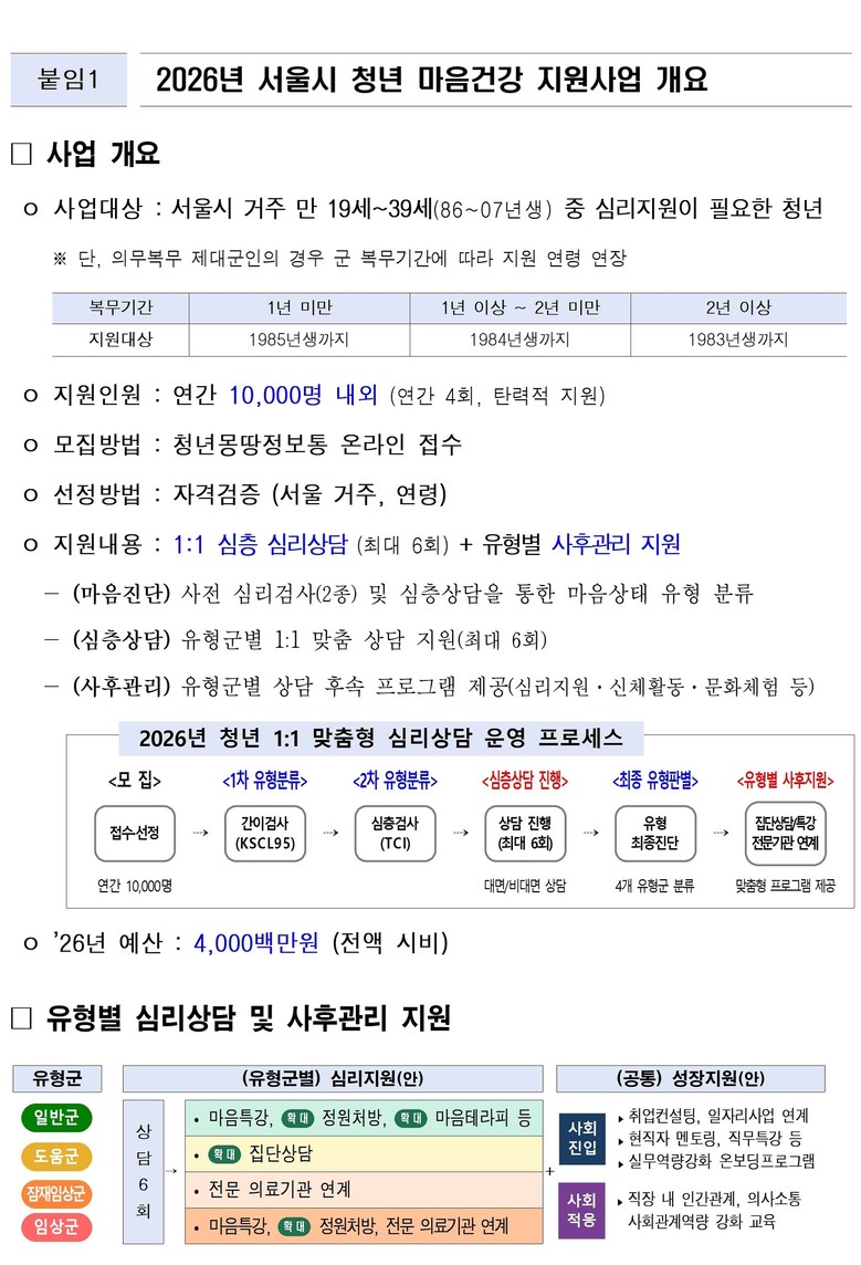 업그레이드된 ‘2026년 서울 청년 마음건강 지원사업’ 참여자 모집은 오는 26일 1차 2,500명을 시작으로 총 4회에 걸쳐 진행된다. 1차 신청 기간은 1월 26일(월) 오전 10시부터 29일(목) 17시까지다. 우울, 불안 등 정서적으로 어려움을 겪고 있는 서울 거주 19~39세 청년이면 누구나 청년몽땅정보통(youth.seoul.go.kr)에서 신청할 수 있다.