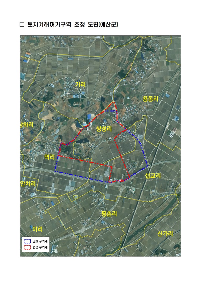 반면 예산군은 2023년 10월 23일 지정한 예산군 삽교읍 삽교리 일원 1177필지 166만 6000㎡ 중 일부(3개 리 412필지 67만 5000㎡)를 해제하고 삽교읍 용동리 7필지 1000㎡를 새롭게 포함했다.