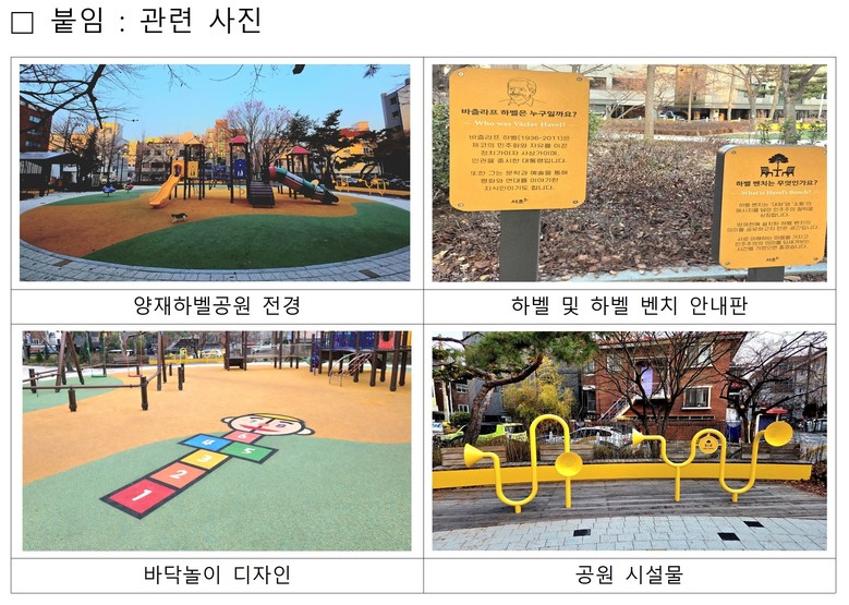 상반기에는 노후화된 기구를 전면 교체해 시설 이용 안전성을 한층 높였고, 하반기부터는 하벨 전 대통령, 하벨 벤치에 대한 안내문과 디자인 시설물 등을 전반에 도입하며 공원이 가진 메시지를 놀이 공간에 담아냈다. 이를 통해 양재천 하벨 벤치에서 시작된 민주적 소통과 대화의 가치가 공원까지 확장하게 될 것으로 기대된다. 또, 공원 내 바닥놀이 디자인을 한국의 사방치기와 유사한 체코 전통놀이 ‘스카카치 파나크’의 모습으로 형상화해 한·체코 양국의 돈독한 우호관계도 상징적으로 구현했다는 평가다.