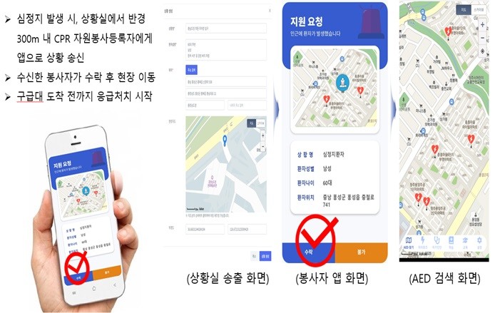 심정지 신고가 접수되면 상황실에서 반경 300m 내 자원봉사 등록자에게 앱으로 상황을 송신하며, 자원봉사자는 요청에 대해 수락 또는 불가로 지원 여부를 선택할 수 있고 수락한 봉사자는 현장으로 이동해 구급대 도착 전까지 응급처치를 하는 방식이다.