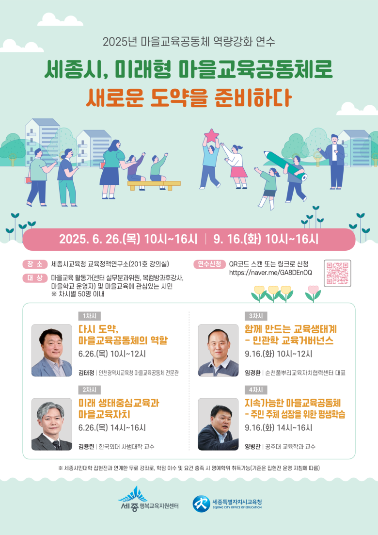 연수는 오는 26일 기초과정을 시작으로 1차시 ‘다시도약, 마을교육공동체의 역할’, 2차시 ‘미래생태중심교육과 마을교육자치’ 교육이 진행될 예정이다.