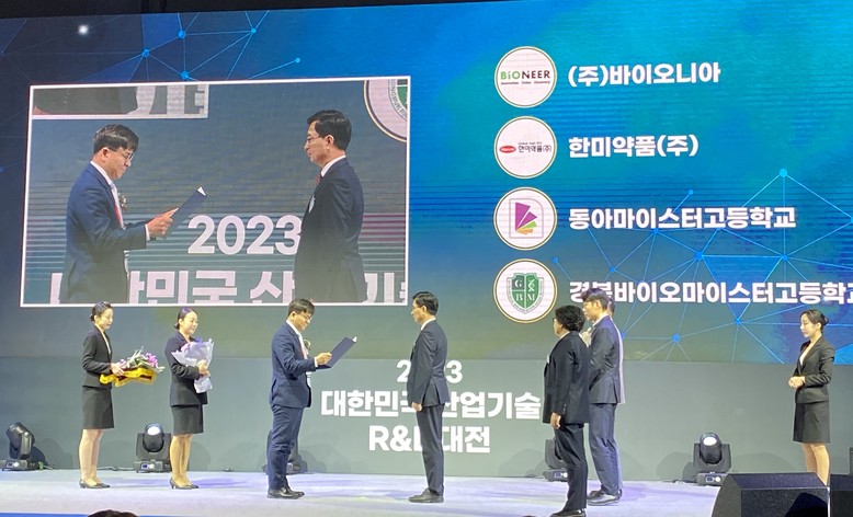 동아마이스터고등학교와 함께 수상한 기업은 ‘바이오니아’이다. ‘바이오니아’는 대전 소재의 유전자 기반 ‘바이오 벤처’ 기업으로 PCR에 사용되는 시약들을 국내 최초로 공급하며 첫발을 내디뎠다. 동아마이스터고등학교와 바이오니아는 진단 장비 설비 엔지니어 전문 인재 양성을 위해 학교와 긴밀한 협력 체계를 구축하고 있다. 바이오니아는 지난 2014년 동아마이스터고등학교와 협약을 체결한 후 지금까지 19명의 학생을 채용하였다.