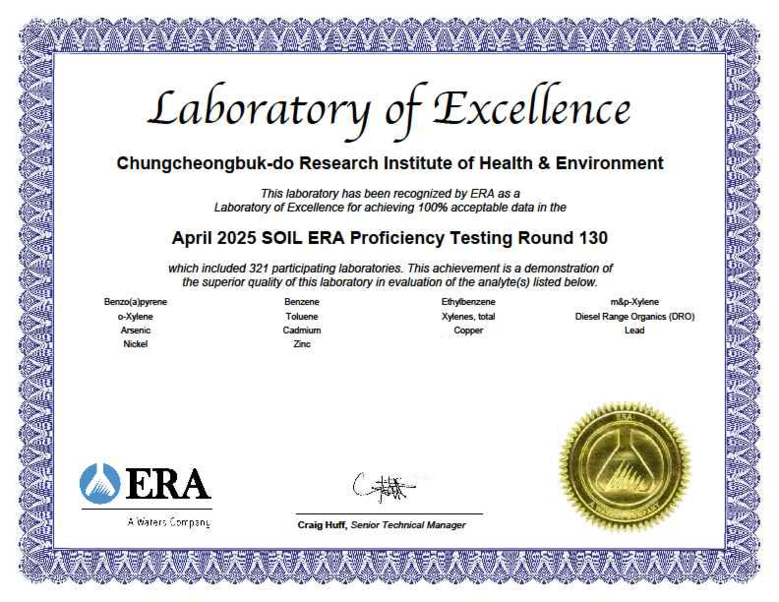 2025년 시험에는 총 321개 기관이 참여했으며, 충북보건환경연구원은 중금속 등 12개 항목 모두에서 최고 등급인 ‘만족’을 획득했다. 이는 2017년부터 매년 빠짐없이 시험을 통과해온 결과로, 9년 연속 국제 분석능력을 공식적으로 인정받은 것이다.