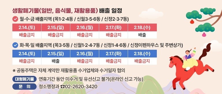주민생활과 밀접한 교통·청소 분야 대책도 꼼꼼히 마련해 주민불편을 최소화한다. 교통대책 상황실을 운영해 실시간 교통정보를 안내하고, 교통 혼잡 지역을 중심으로 불법 주·정차 단속을 병행한다. 또 청소 상황반은 동별 생활폐기물 수거 일정 안내 및 무단 투기 등 불편 민원을 접수하고, 순찰기동반은 주요 도로변과 노면에 적치된 쓰레기를 처리해 쾌적한 거리 환경을 조성한다.