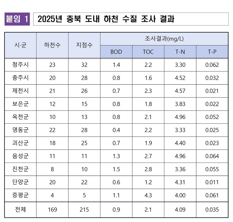 한편, 이번 조사 결과는 각 시군에 공유돼 하천 관리에 활용되도록 했으며, 충청북도보건환경연구원 누리집에서도 확인할 수 있다.