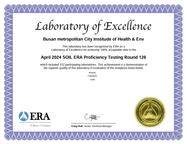 2024년 80여 개국이 참여한 국제숙련도 평가 중 ▲먹는 물 분야 17개 항목 ▲수질 분야 21개 항목 ▲토양 분야 12개 항목 ▲환경 유해인자(모래) 분야 3개 항목 등 평가받은 전 항목에서 최고 등급인 ‘만족(Satisfactory)’을 받았다.