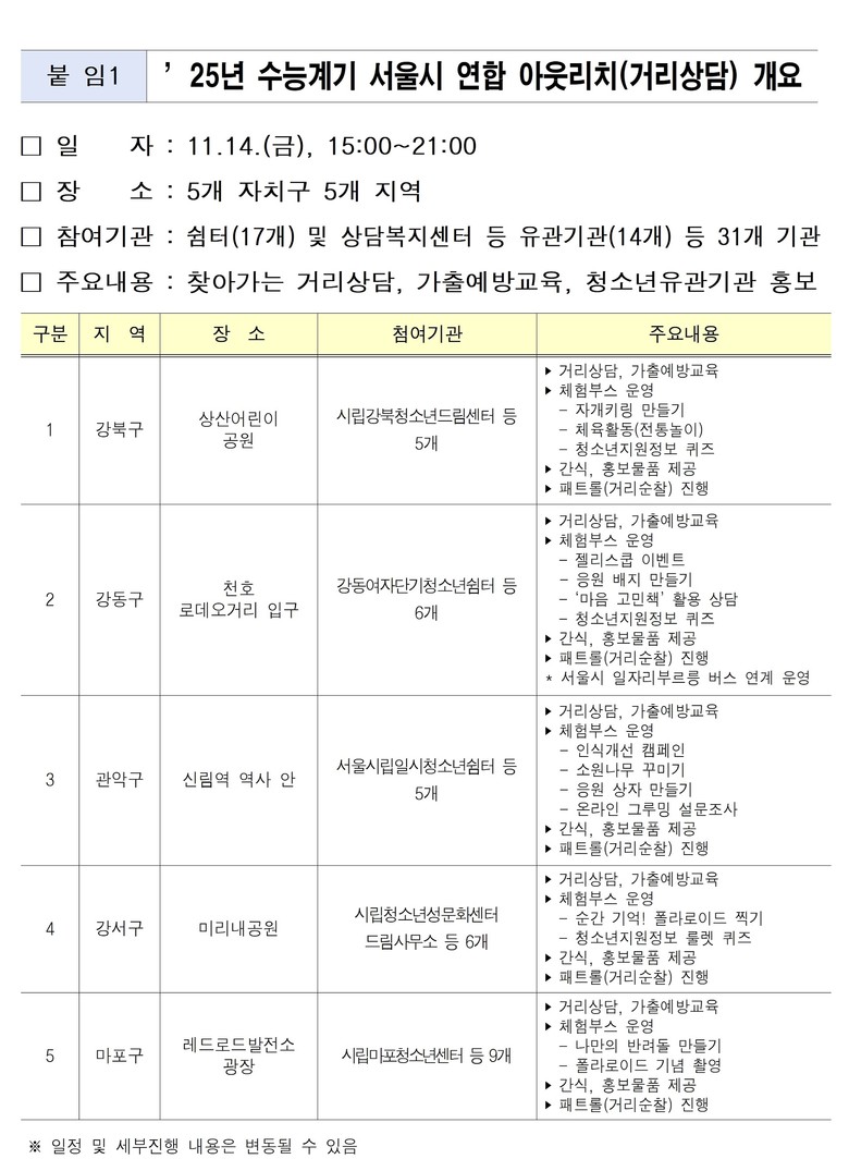 [서울 세계타임즈=이장성 기자] 서울시가 대학수학능력시험 다음 날인 14일(금) 오후 31개 청소년 지원기관과 함께 홍대, 신림 등 청소년 밀집 지역 다섯 곳에서 거리상담을 펼친다.