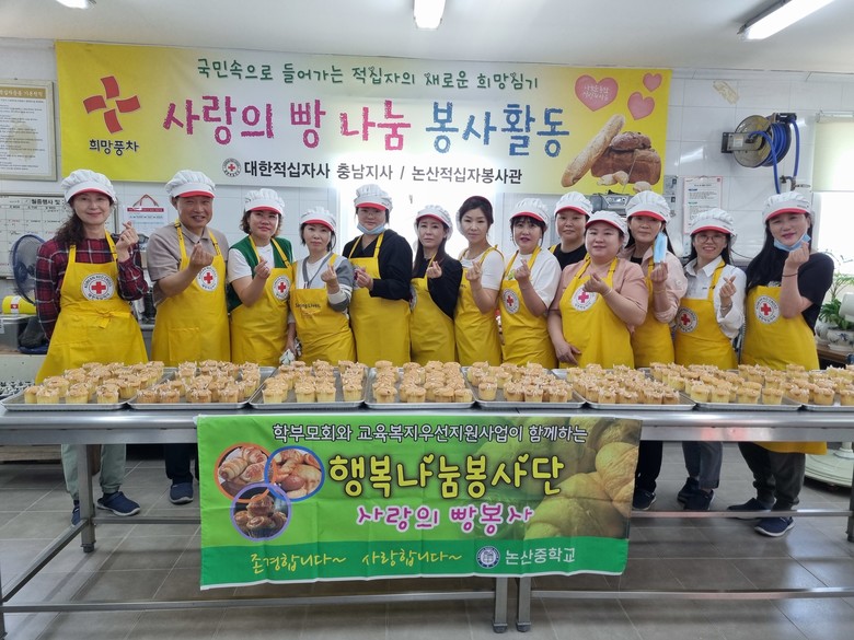 이번 봉사활동은 교육복지우선지원사업과 연계한 활동으로 학부모회 행복나눔봉사단은 아침 일찍부터 빵을 구워 논산애육원에 방문했다. 이후 오후에는 체육대회 열기로 가득찬 논산중학교 교정을 찾아 학생들에게 전달했다.