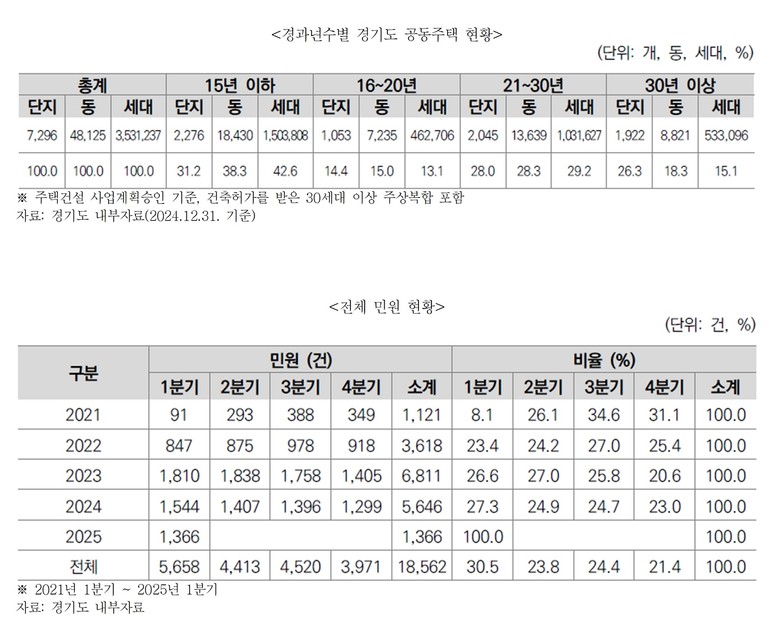 특히 경기도 공동주택의 절반 이상이 준공 후 20년이 넘은 노후 단지이며, 30년 이상 단지도 26.3%에 달한다. 시설 교체 주기 도달과 안전관리 수요가 증가하는 시기에 비해 현재의 행정・지원체계는 충분히 정비되지 못한 것으로 분석됐다. 실제로 연간 약 10조 원 규모의 관리비가 집행되고 있지만, 장기수선충당금의 적정한 사용과 우선순위 결정 등 주요 분야는 체계적 컨설팅과 지도 시스템이 부족한 상황이다.