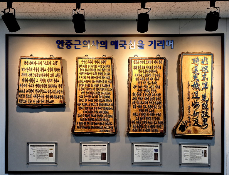 전시 공간에는 안중근 의사의 친필 유묵을 서각으로 표현한 작품 1점을 비롯해 ▲안중근 의사 어머니 조마리아 여사의 편지글 ▲어머니 전상서 ▲동포에 고함 등 안 의사의 정신을 담은 서각 작품 4점이 전시돼 있다.