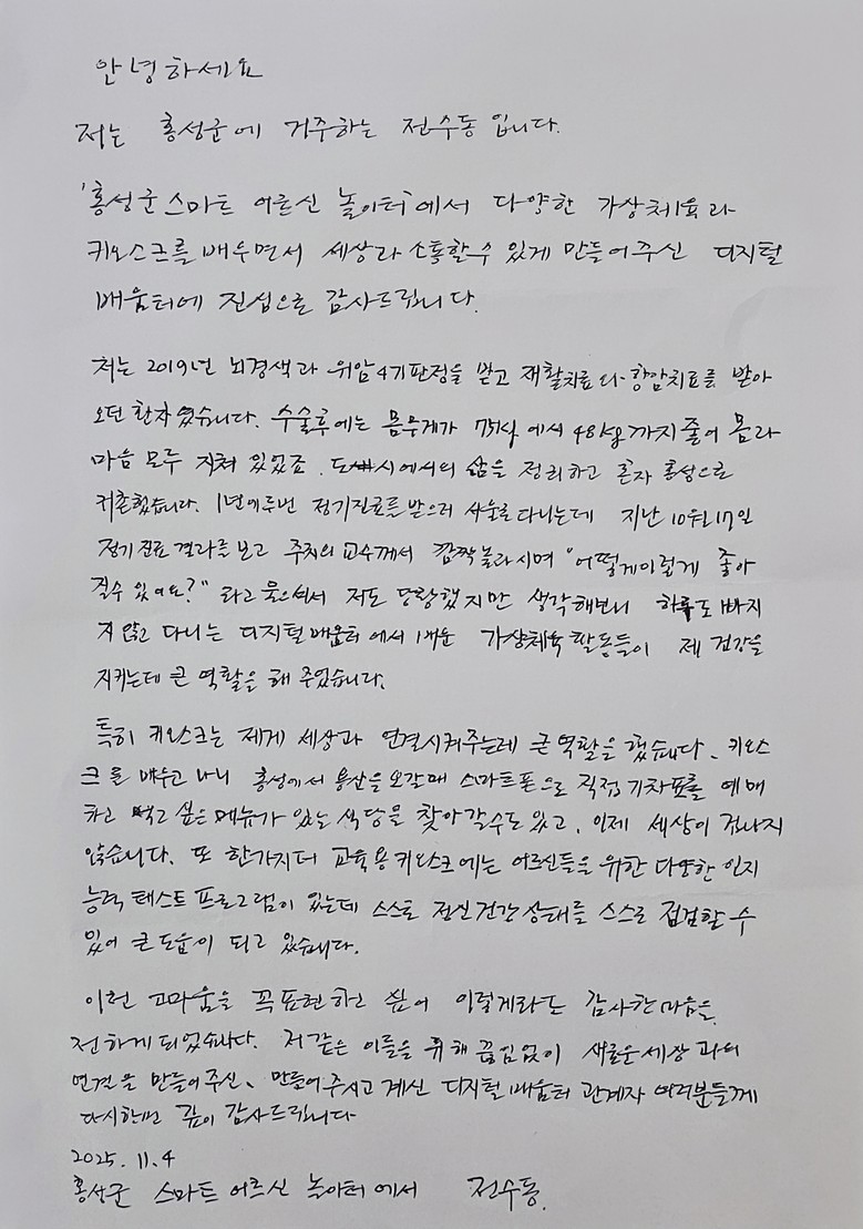 최근 홍성군 스마트 어르신 놀이터에서 디지털배움터 교육을 수강한 전수동(71) 씨는 “디지털 기기를 배우면서 세상과 다시 연결되는 기분을 받았다”라며 감사의 뜻을 담은 편지를 도에 전달했다.