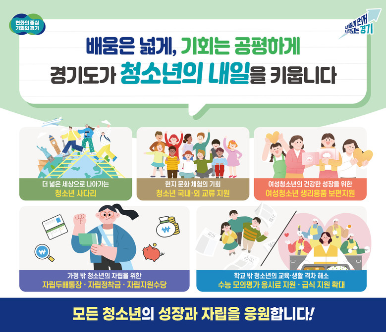 - 경제적 여건이 어려운 청소년에게 해외연수 기회를 제공하는 청소년 사다리 - 자매교류 시도, 중국 장쑤성·광둥성 등과 국내·외 청소년 문화브릿지 - 여성 청소년 생리용품 지원, 24개 시군에서 27개 시군으로 확대 - 가정 밖 청소년의 자산 형성과 생활 안정을 위한 자립두배통장·자립정착금 지원 - 학교 밖 청소년 급식 지원과 진로·취업 연계를 통한 사회 진입 지원 [경기도 세계타임즈=송민수 기자] 경기도가 청소년의 건강한 성장과 배움 기회, 생활 안정을 위해 급식, 학습·진로·자립 지원까지 아우르는 다양한 정책을 추진한다.