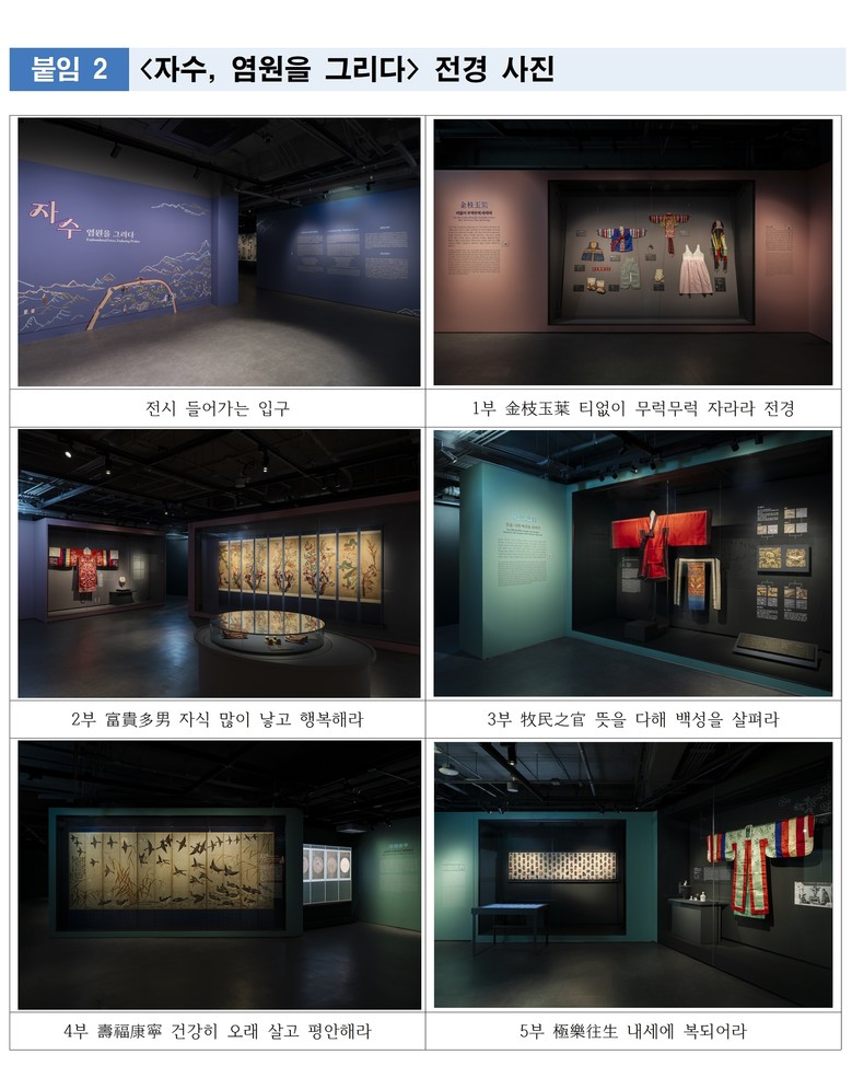 1부에서는 ‘돌띠’를 비롯해 아기 옷에 수놓은 자수품을, 2부에서는 활옷을, 3부에서는 고을 수령의 선정(善政)에 감사하는 ‘만민송덕’ 병풍을, 4부에서는 평안한 노후를 바라는 ‘노안도’ 병풍을, 마지막 5부에서는 행복한 내세를 바라는 ‘김선희 혼례복’ 등 각 주제마다 사람들이 바란 염원을 담은 자수품을 전시했다.