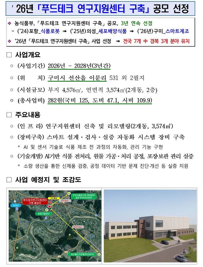 스마트제조 푸드테크 연구지원센터는 2026년부터 3년간 총사업비 282억원(국비 125억원)을 투입해 구미시 선산읍 일원에 구축된다.