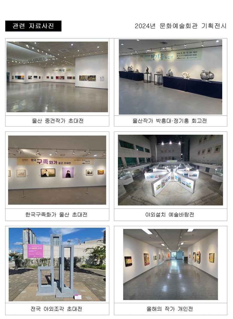 한편, 울산문화예술회관은 지난 2024년에는 다양한 전시를 통해 울산 예술계와 시민들에게 풍성한 문화 경험을 제공했다. 대표적으로 ‘울산 중견작가 초대전’을 통해 지역 출신 중견작가들의 작품을 선보였으며, ‘울산작가 박흥대·정기홍 회고전’에서는 작고한 울산 작가들의 예술적 발자취를 조망했다. 도심 속 야외 공간에 평면예술작품을 설치한 ‘야외설치 예술바람전’은 시민들에게 독특한 문화향유의 기회를 제공하며 큰 호응을 일으켰다.