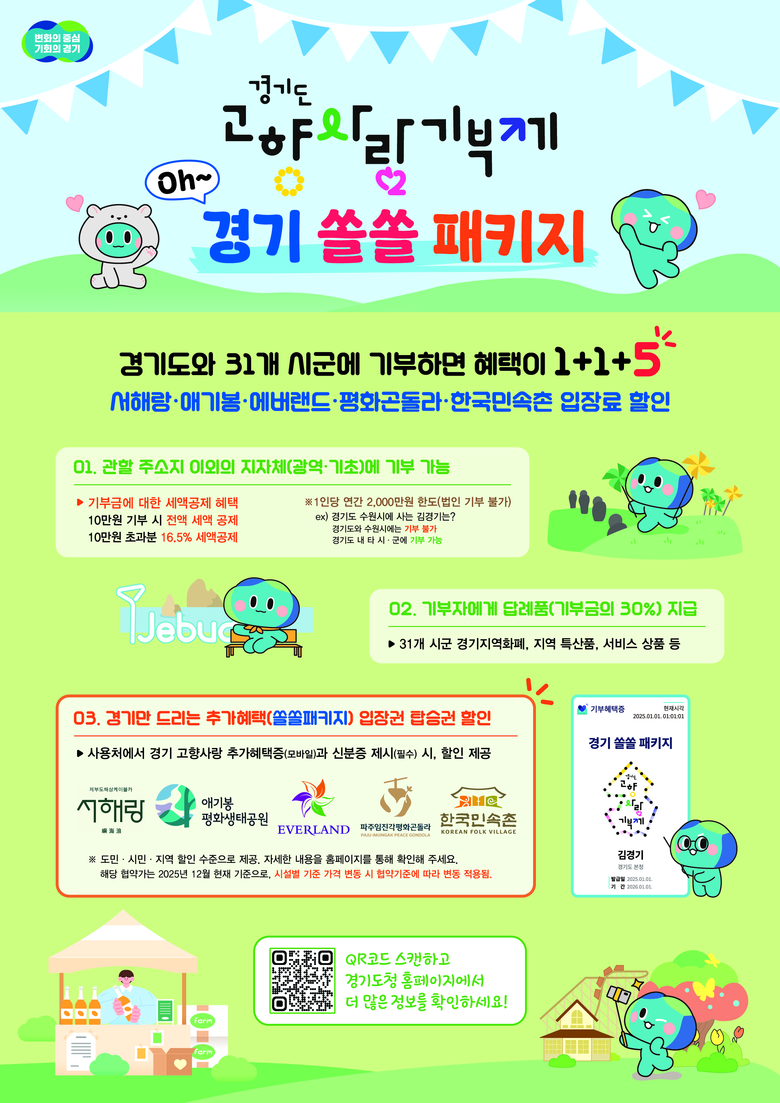 도는 기부 참여를 독려하고 관광 소비를 지역으로 이끌기 위해 세액공제와 답례품에 더해 경기도만의 추가 혜택을 담은 ‘고향사랑 쏠쏠패키지’를 기획했다.