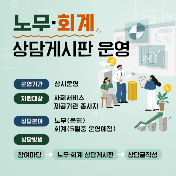 부산사회서비스원 누리집(busan.pass.or.kr) 내 참여마당>노무·회계 상담게시판에서 이용할 수 있다.