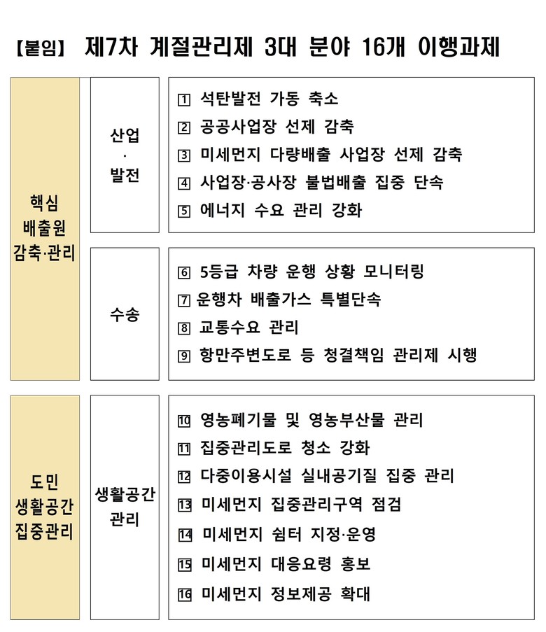 도는 계절관리제 기간 산업·수송·생활 등 전 분야를 대상으로 3대 분야 16개 이행과제를 추진해 대기질 개선과 취약계층 보호에 총력을 기울일 계획이다.